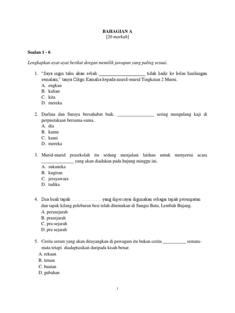 Bahagian A Lengkapkan Ayat Ayat Berikut Dengan Memilih Jawapan Yang Paling Sesuai Pdf
